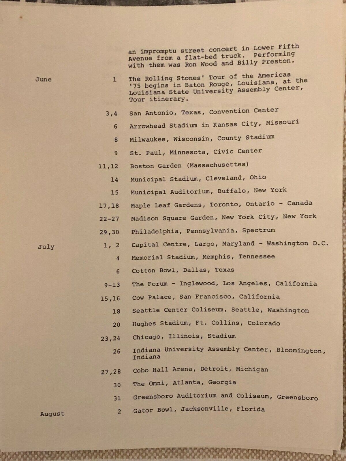 - One of my favorite one-of-kind items from my collection: an actual gate card that was hanging in Chicago Stadium during the Stones’ tour stop there in 1975, complete with nine different color-coded tickets (all unused, un-punched, and pristine, lightly glued to a thick paper stock backing) and seating directions for ticket-holders navigating the stadium for the Stones show. I obtained this unique item directly from the surviving son of a longtime vendor and employee of Chicago Stadium, who had passed away and who apparently, punched and collected tickets among other duties for many rock shows and sports events. Seems he had the foresight to save a few notable mementos from the era. This was one of them.
