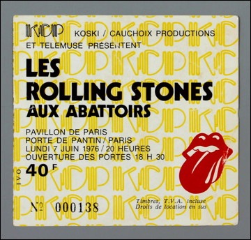 - One of my favorite one-of-kind items from my collection: an actual gate card that was hanging in Chicago Stadium during the Stones’ tour stop there in 1975, complete with nine different color-coded tickets (all unused, un-punched, and pristine, lightly glued to a thick paper stock backing) and seating directions for ticket-holders navigating the stadium for the Stones show. I obtained this unique item directly from the surviving son of a longtime vendor and employee of Chicago Stadium, who had passed away and who apparently, punched and collected tickets among other duties for many rock shows and sports events. Seems he had the foresight to save a few notable mementos from the era. This was one of them.