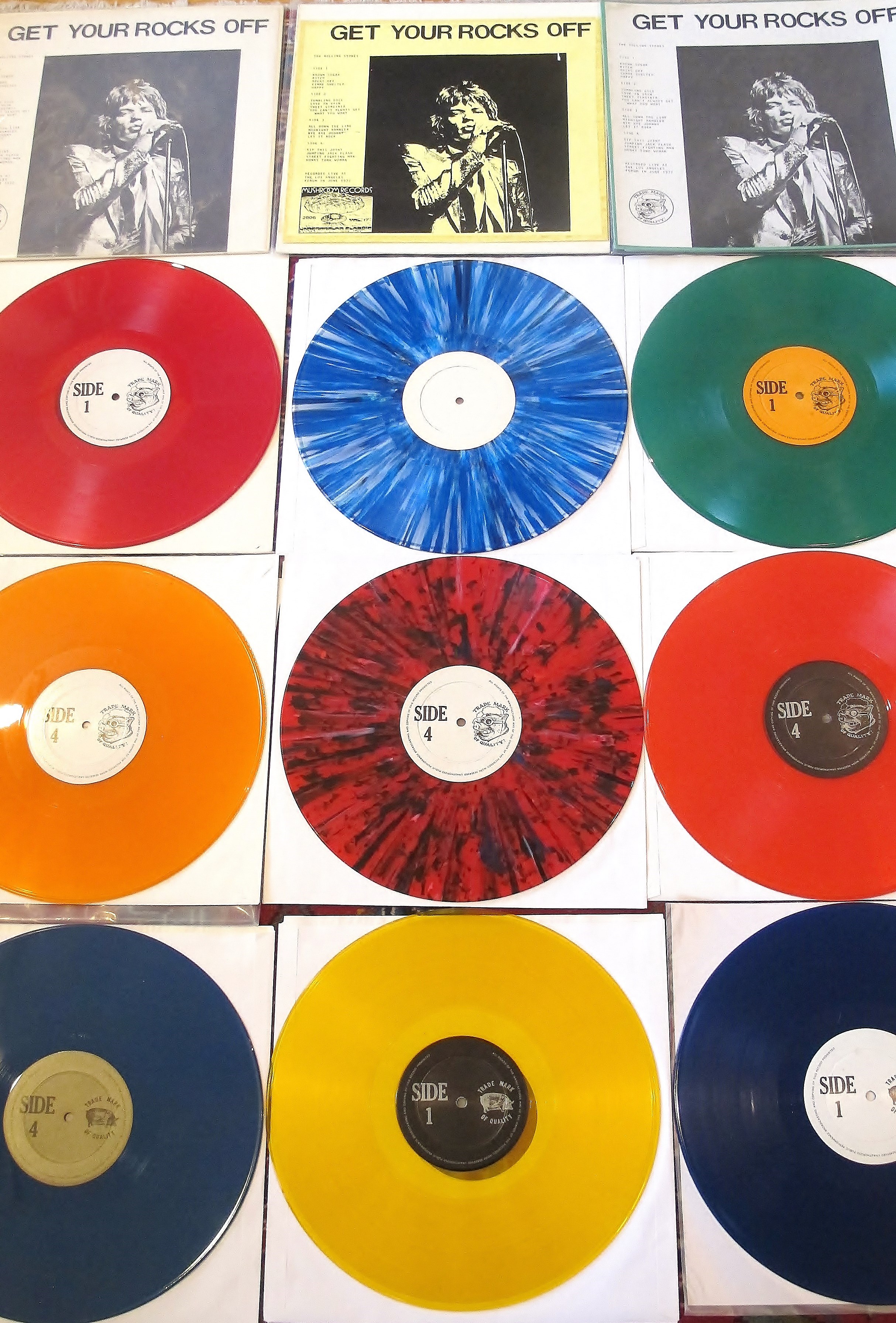 - Just doin’ what the man says in the title. I think this about covers all of my variations of “Get Your Rocks Off” — including the magnificent rare splash wax Mushroom Records variation. One of my favorite ’72 onstage shots of Mick in gold lame jacket, enviable rock & roll hair, cat-swallowed-mouse expression, and hand on hip.